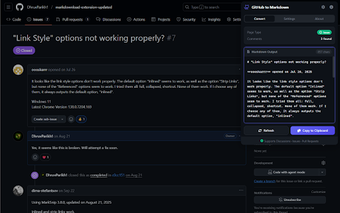 핵심 기능 외에도 GitHub to Markdown는 사용자가 타임스탬프 및 중첩된 답글을 전환할 수 있는 사용자 정의 가능한 출력 옵션을 제공합니다. 또한 시스템 테마에 맞춘 다크 모드를 포함하여 다양한 조명 조건에서 사용성을 향상시킵니다. 이 확장 프로그램은 GitHub 내에서만 작동하여 외부로 데이터가 전송되지 않으며 모든 처리가 로컬에서 수행되어 개발자와 협업자를 위한 개인 정보 보호 중심의 솔루션을 제공합니다.